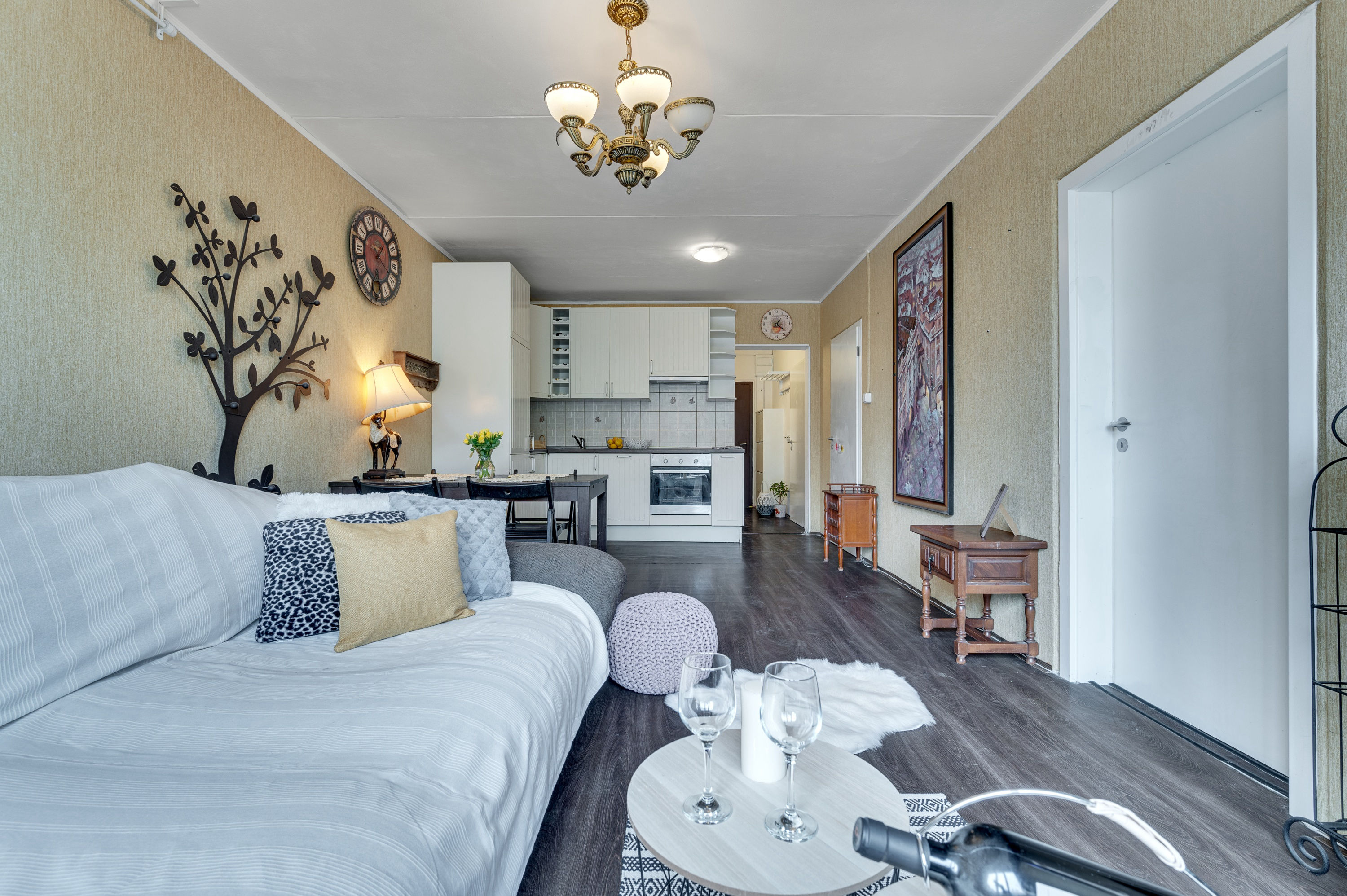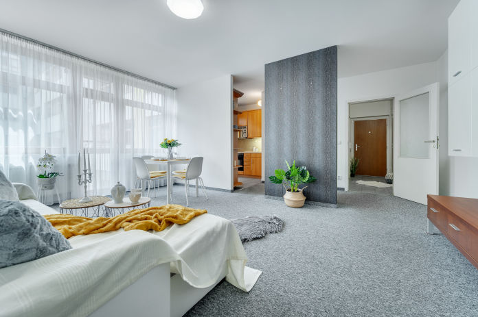 Byt byl oproti původním prázdným prostorům vybaven vhodnými doplňky. Díky homestagingu má příjemnou atmosféru.